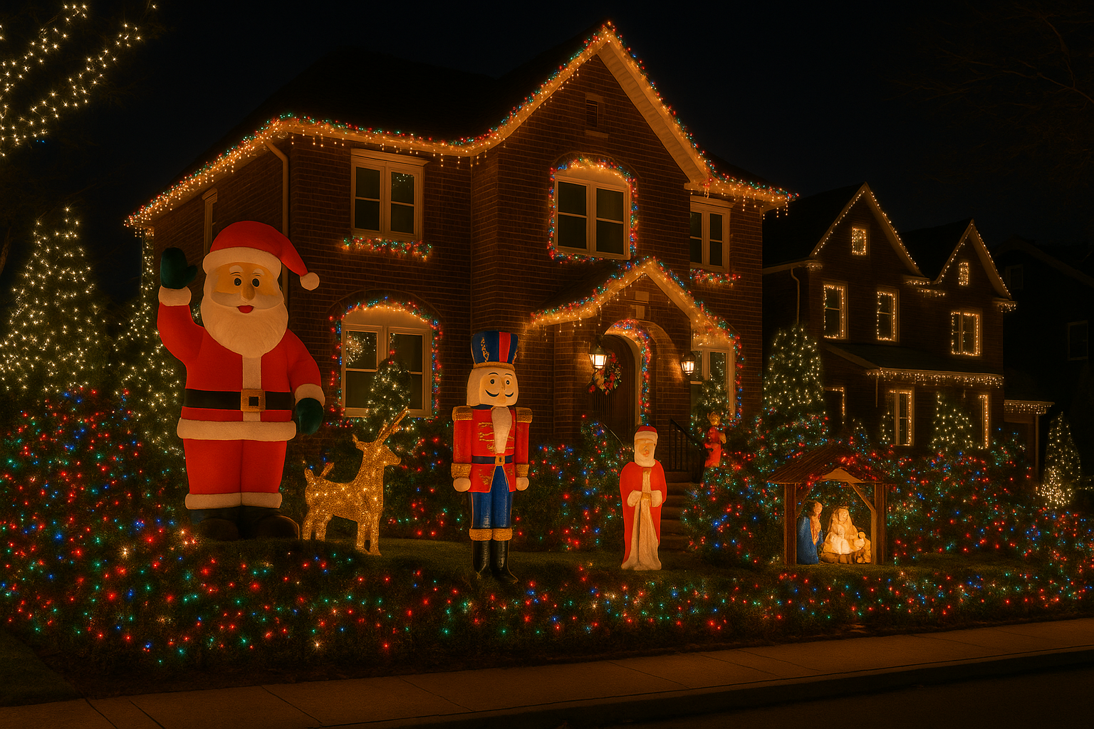 The lights now stretch across several blocks, with visitors walking through streets lined with huge Santas, snowmen, reindeer, Nutcrackers, nativity scenes, and bright holiday lights. Some homes feature timed light displays and Christmas music, while others focus on large visual setups designed by homeowners or professional decorators. There are no tickets or formal entrances, which makes the experience easy and flexible.